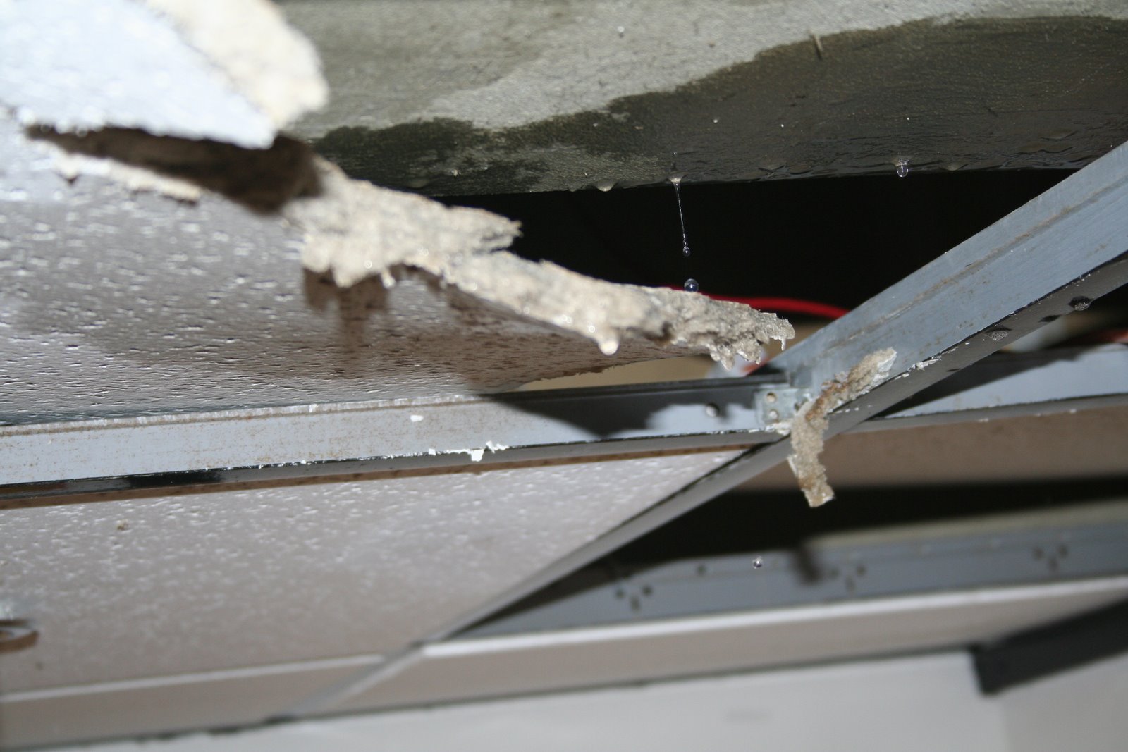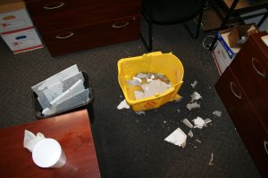 Tonight I got a call letting me know that it was raining down in the Campus Towers office. I thought it was our new sprinkler system malfunctioning, but it turns out to be an overzealous washing machine in the laundry room (directly overhead the office). Fortunately – it leaked in the one semi empty place in the office and missed any electronic equipment of files. It was the nastiest feeling in the world taking out those tiles!