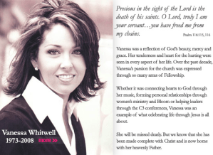 Last sunday a friend of mine from Fellowship Church passed away due to a brain hemorrhage. Vanessa was an amazing multi-facetted person. I first saw Vanessa singing with Fellowship Church at the Creative Church conference in 2005. Many people from my church got to know Vanessa via her appearances on the In the Zone DVD singing “Kaching!” and her singing at the Christmas Eve Service at the American Airlines Center. I was fortunate enough to have dinner with her and her husband at the C3 conference in 2006. She was so very positive and encouraging. She was genuinely interested in my church, and was such a motivation to take what we were doing to the next level. She was very excited about her transitioning from music over to women’s ministries. Her “Bloom” events were some of the most creative and exciting women’s ministries I have ever seen. My thoughts and prayers are with Ed and everybody at fellowship during this difficult time.